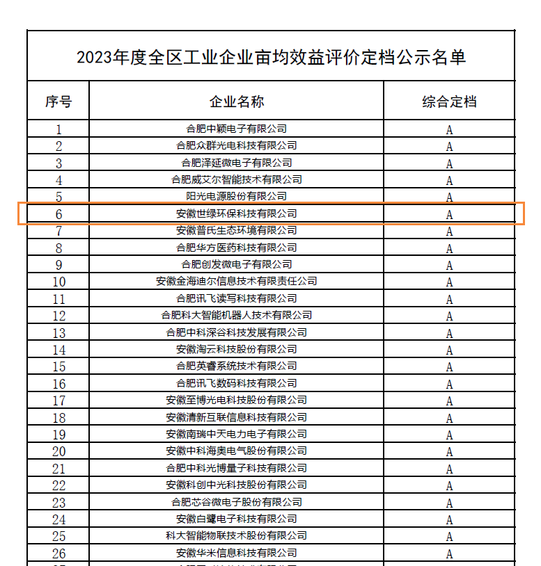 在此次評選中,安徽世綠環??萍加邢薰纠^續定檔為A檔。此次評選是高新區為認真貫徹落實省、市關于深化“畝均論英雄”改革的決策部署,根據《深化“畝均論英雄”改革促進制造業高質量發展的意見》、《合肥市工業企業畝均評價辦法3.0》等文件精神,并結合高新區實際進行的評選。